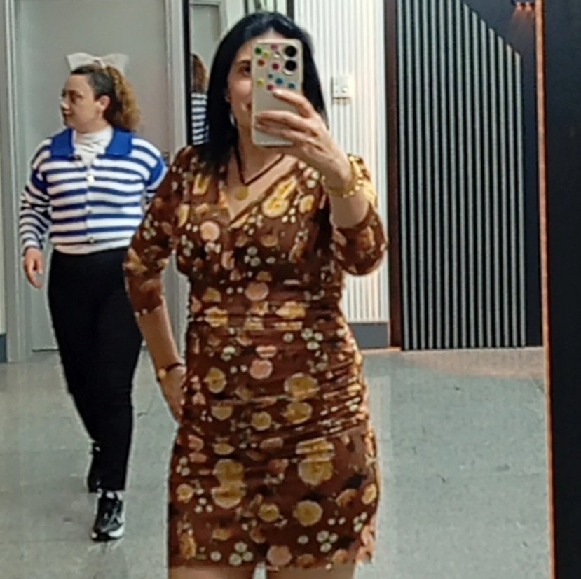 V yaka ve uzun kollu, drapeli, koyu kahverengi batik desenli midi elbise. Yumuşak sentetik kumaştan, günlük sokak stili için uygun.