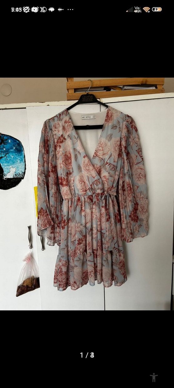 V yaka ve uzun kollu, bol kesim mini elbise. Drapeli ve çiçek desenli, yumuşak sentetik kumaştan yapılmıştır. Günlük kullanım için uygundur.