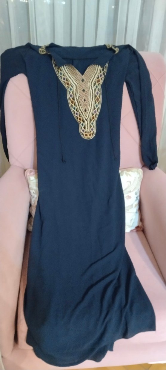 Dar kesim, uzun boy bohem elbise, V yaka ve uzun kolludur. Sentetik kumaştan yapılmış, drapeli detaylar ve koyu mavi nakışlarla günlük kullanıma uygundur.