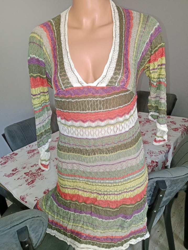 Bu dar kesim örgü elbise, V yaka ve uzun kollu olup, yumuşak pastel tonlarda renkli desenlere sahiptir. Örgü kumaşı ve bohem tarzıyla öne çıkar.
