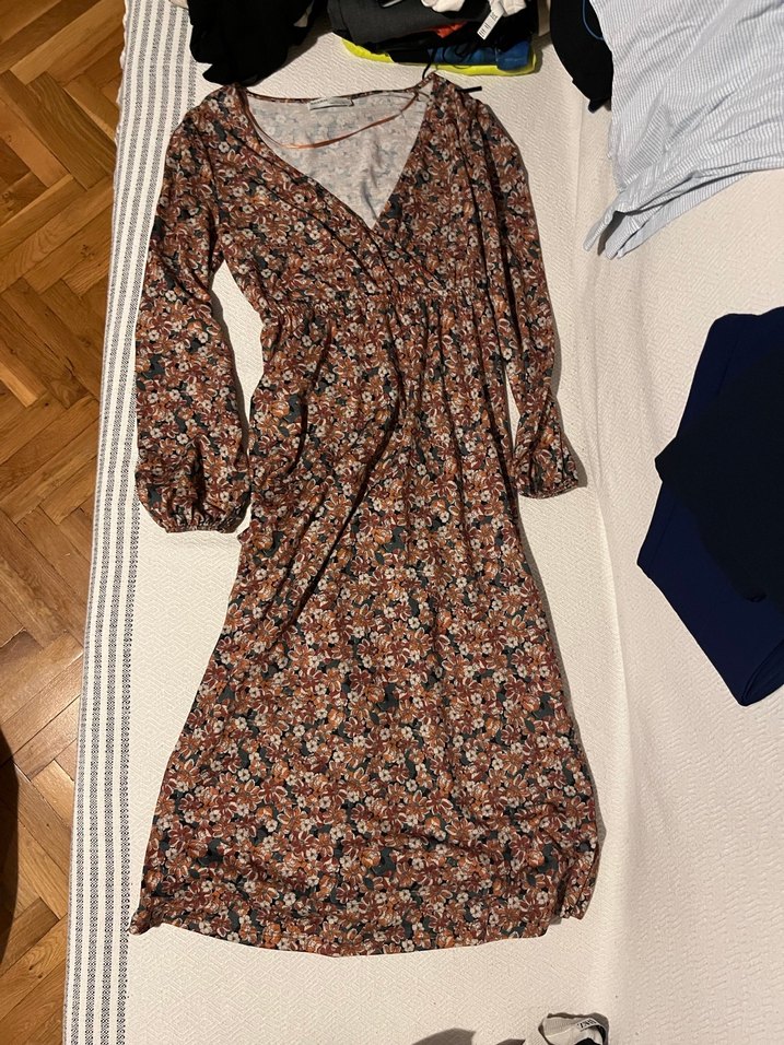 PULL AND BEAR. Uzun. Bohem tarzda, bol kesim , uzun kollu elbise. Sentetik kumaştan, V yaka ve koyu kahverengi batik desenli, günlük kullanım için uygun.