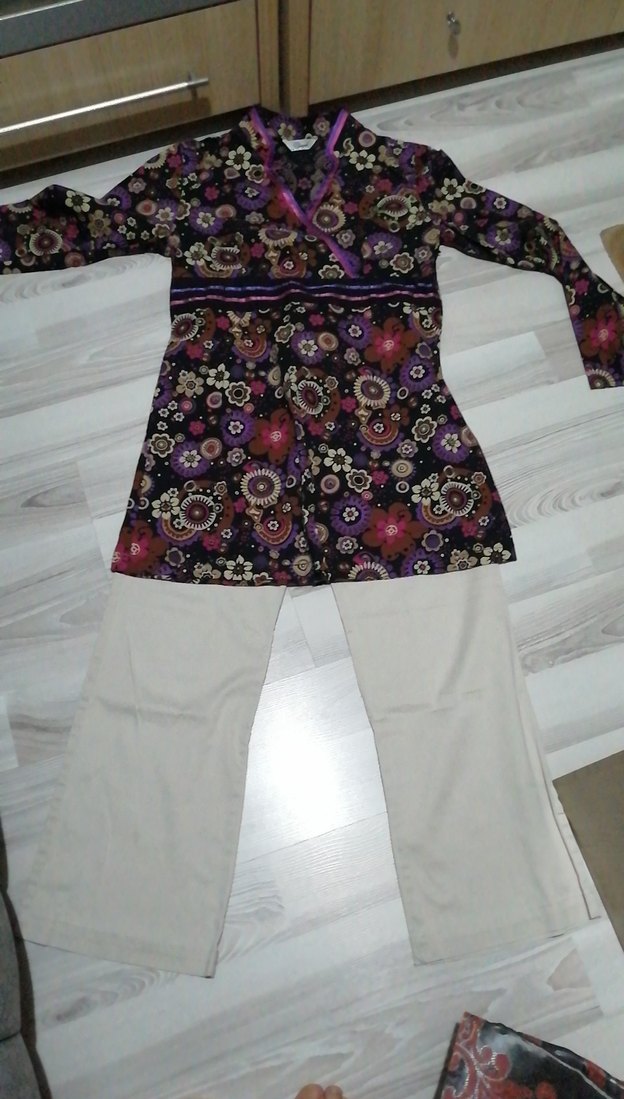 Bohem tarzda, koyu mor baskılı, uzun kollu, V yakalı, kemerli, midi uzunlukta bol kesim hamile tunik.