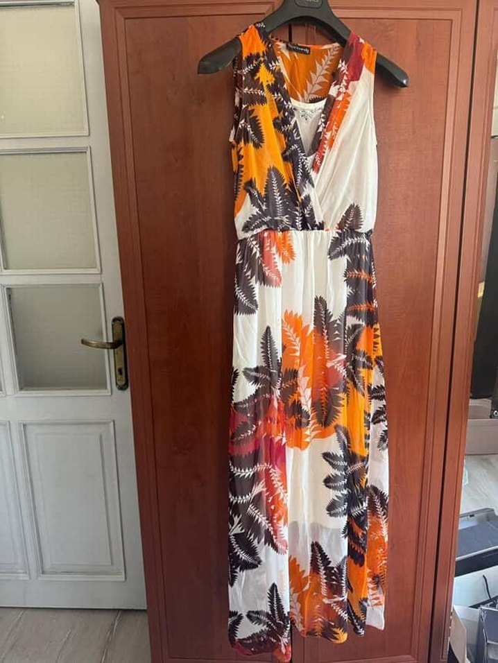 Kolsuz, V yakalı, drapeli ve bol kesim uzun elbise. 36 beden temiz