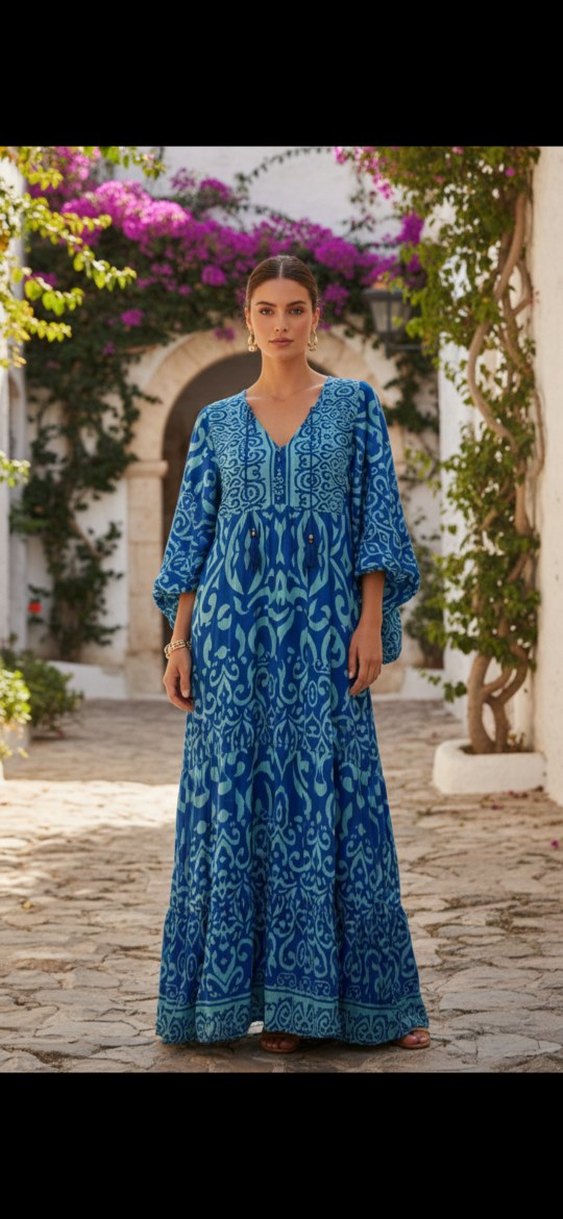 Koyu mavi batik desenli, bol kesim yarasa kolu elbise. Uzun kollu, V yakalı ve püskül detaylı bohem tarzda 1-2 kez giyilmiştir 2 beden