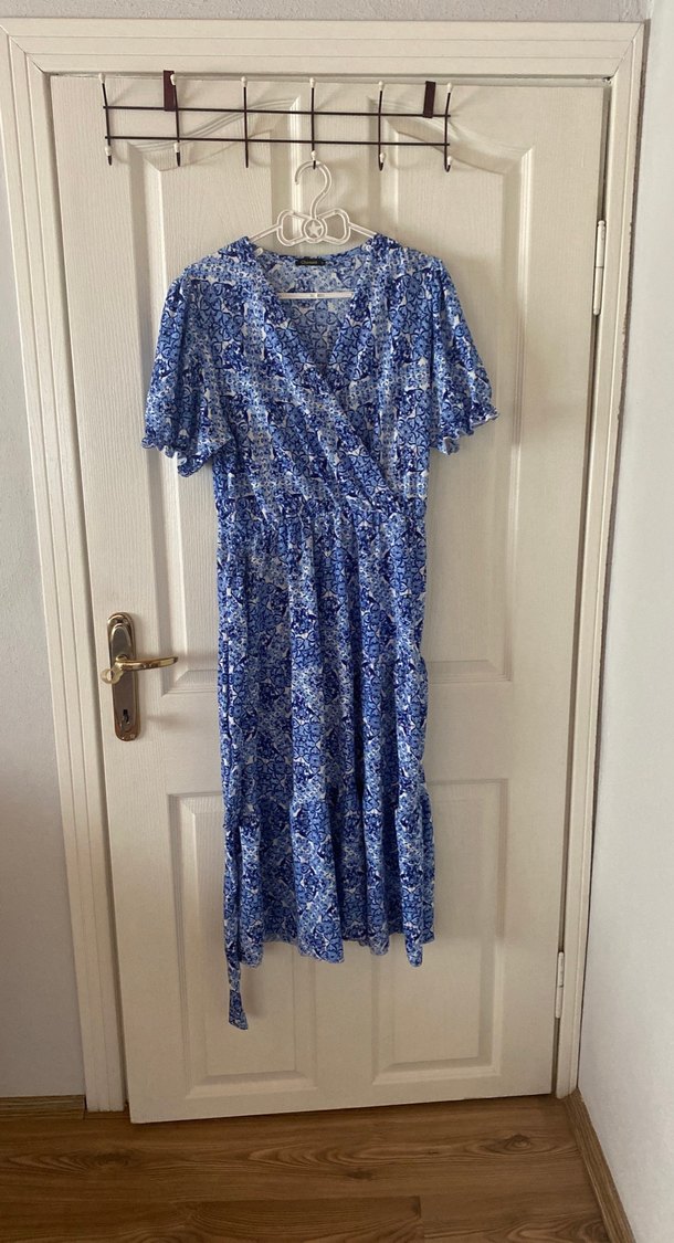 Mavi, kısa kollu, salaş kesim, drapeli uzun elbise. Sentetik kumaştan, V yakalı, batik desenli, günlük kullanım için uygun. S beden ancak esnek m ile uyumlu