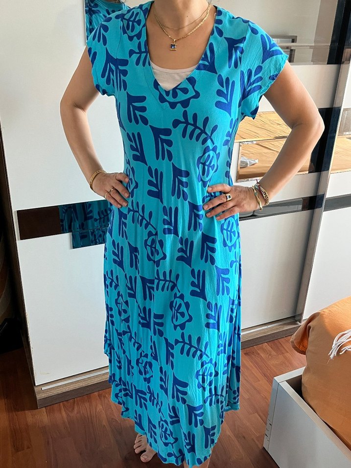 Uzun, turkuaz renkli, bol kesim V yakalı kısa kollu elbise. Renkli batik desenli, dökümlü yapıda, yumuşak sentetik kumaştan, günlük kullanım için uygun. viskon kumaş %100 pamuk