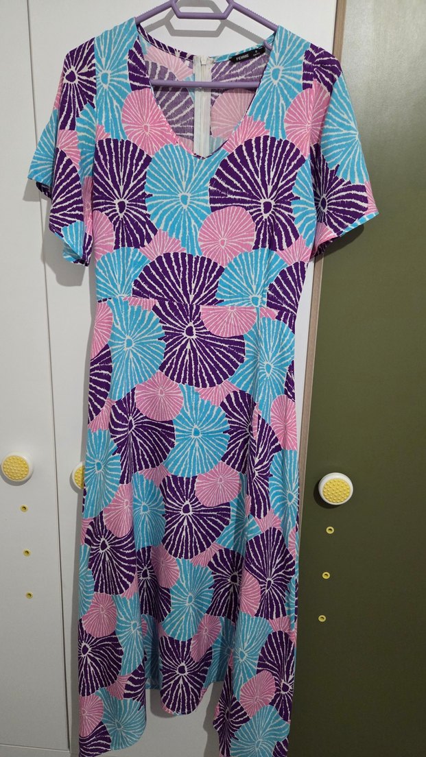Pastel renklerde batik desenli, uzun kloş elbise. Kısa kollu, V yakalı ve bol kesimdir, bohem tarzı yansıtır. Yazlık astarsız yanlar uzun etek kısmında 10 cm bi yırtmaç mevcut Boy yanlar 120 cm orta 110 cm bel 70 cm göğüs 41 cm
