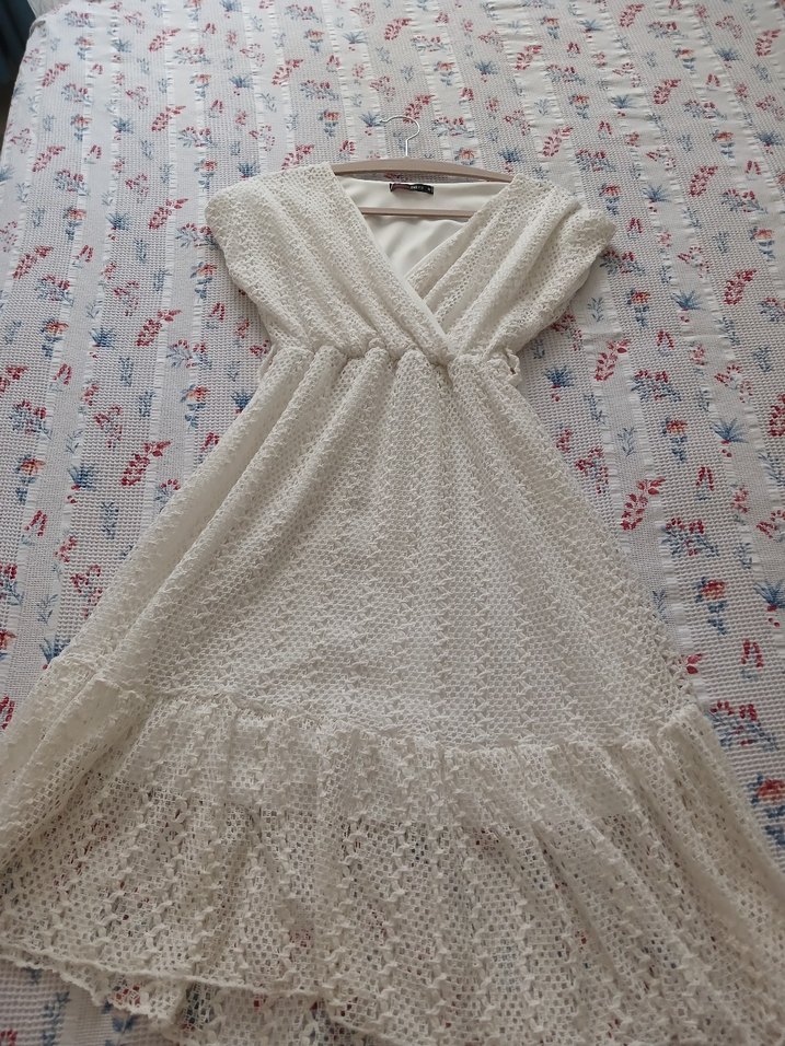 Bohem V Yakalı Beyaz Dantel Örgü Elbise