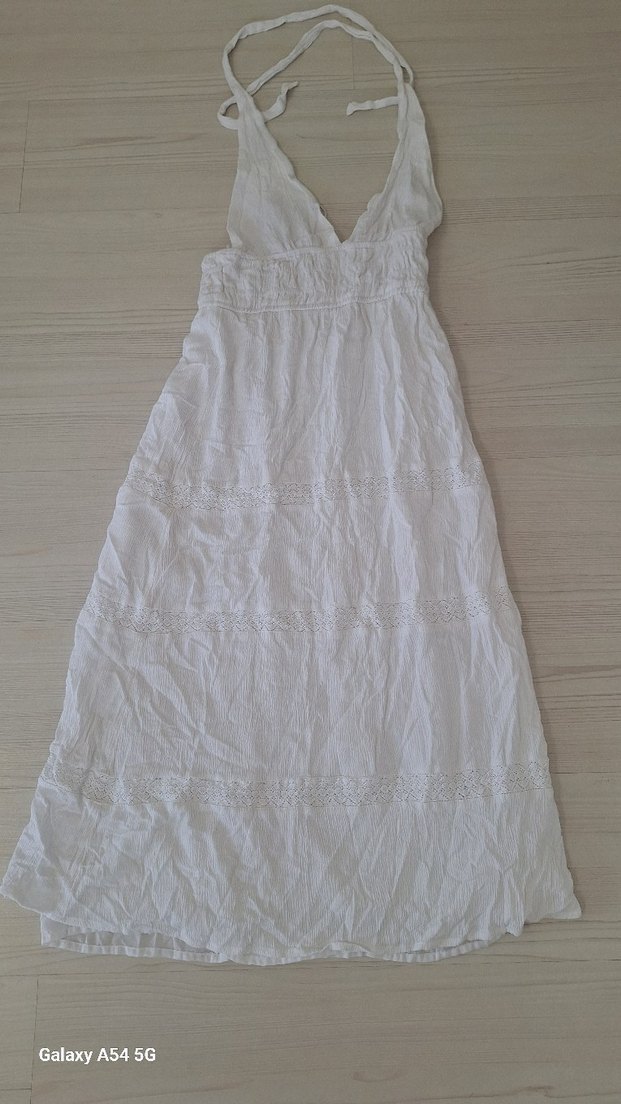 Keten kumaştan yapılmış, kolsuz, V yakalı beyaz uzun elbise. Bol kesimli ve drapeli detaylarla bohem tarzını yansıtır.
