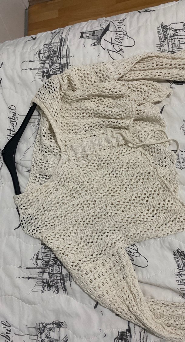 Beyaz, V yakalı, askılı kollu, kısa ve bol kesim örgü kadın kazak. Bohem tarzıyla günlük kullanıma uygundur.