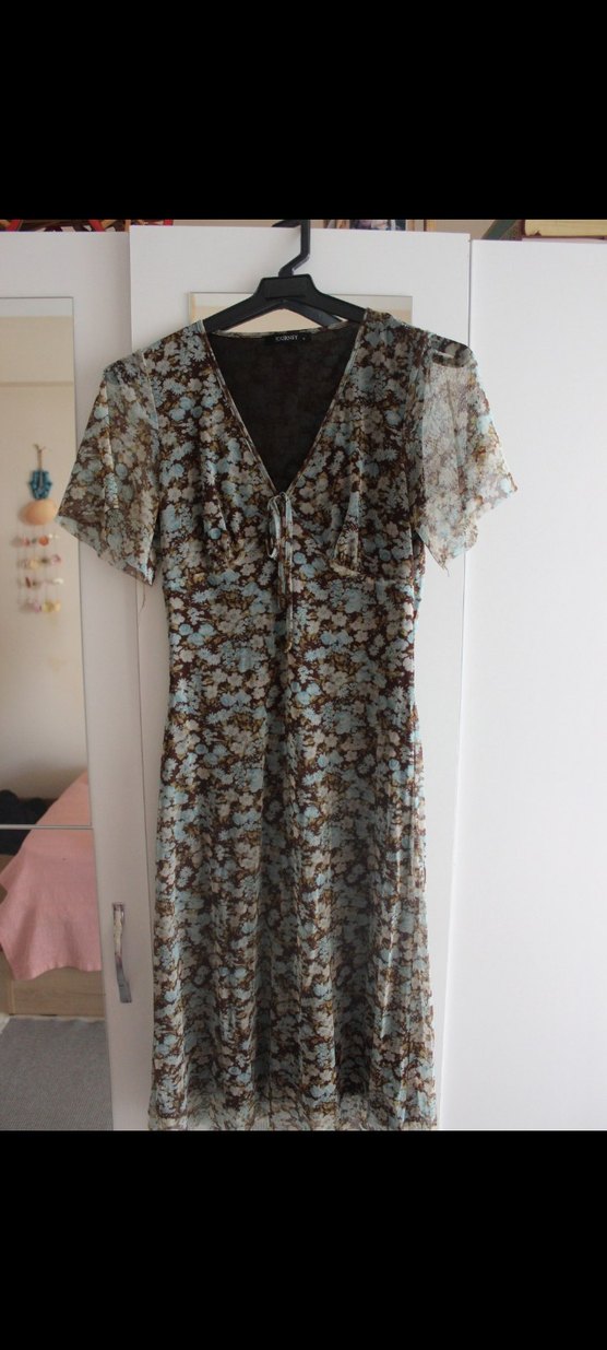 Bohem tarzda, kısa kollu, V yakalı ve dökümlü bağlamalı midi elbise. Kahverengi ve gri tonlarda batik desenli, yumuşak dokulu kumaştan günlük kullanım için uygun.