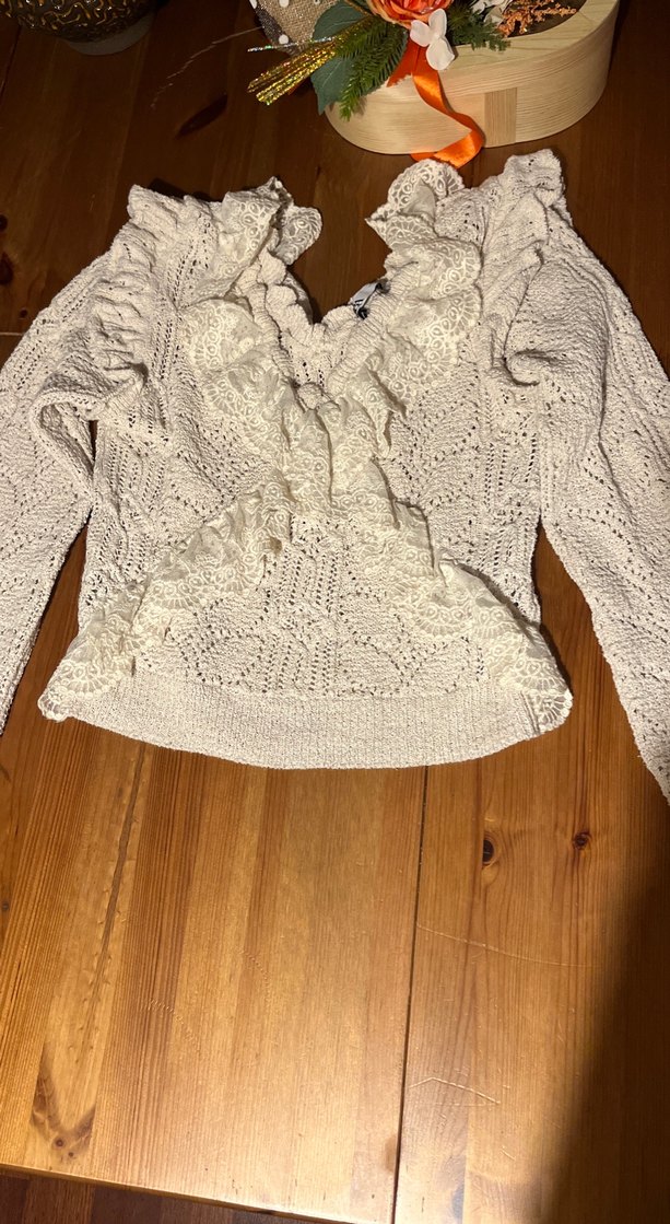 Beyaz örgü kazak, V yakalı ve nakışlı desenlere sahip, uzun kollu ve bol kesim. Rahat ve bohem tarzda, günlük kullanım için uygundur. ❄️