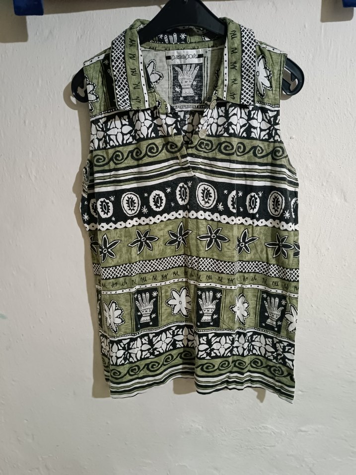 V yakalı, örme, desenli, yeşil ve gri tonlarda, bol kesim, kolsuz bohem kadın bluz. Günlük kullanıma uygun.