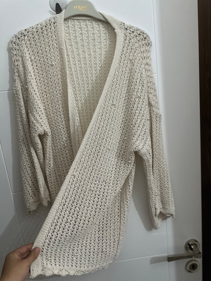 Kadın hırka, bol kesim ve uzun kollu, örme yumuşak kumaştan, düz gri renkte. V yakalı, rahat ve bohem tarzda, günlük kullanıma uygun.