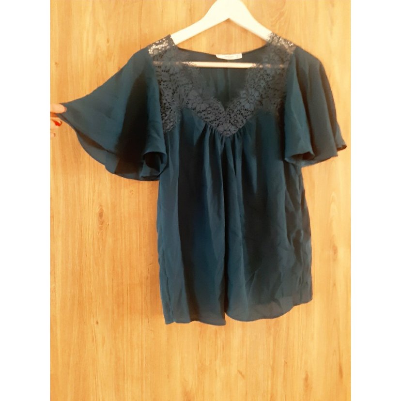V yakalı, kısa ve drapeli kollu, turkuaz renkli, ipeksi dokulu, dantel detaylı bohem kadın bluz, romantik akşamlar için uygun.