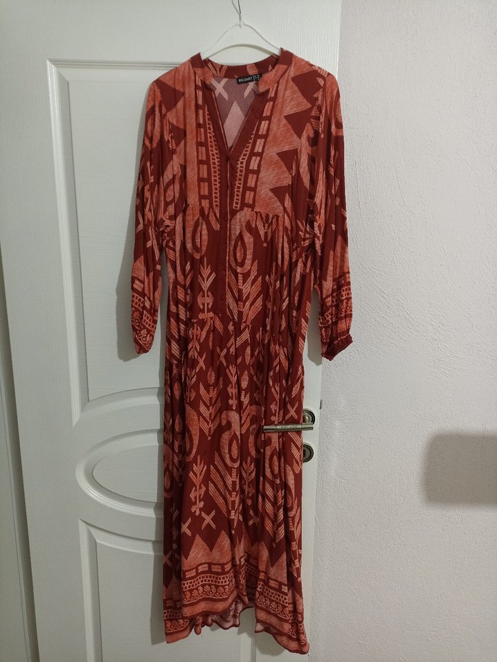 V yakalı, uzun kollu, bol kesim bordoi elbise. Bohem tarzda, drapeli ve batik desenlidir. Günlük kullanıma uygundur. 40 46 bedene uyumlu