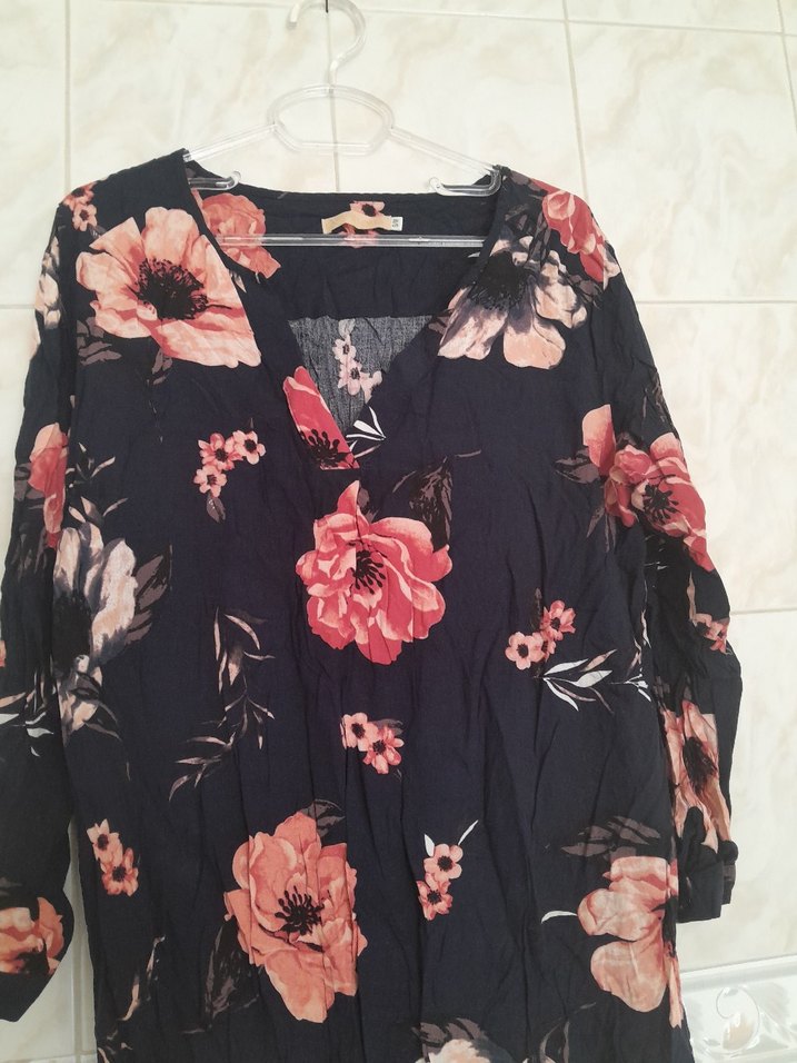 Bohem tarzda, V yakalı ve uzun kollu, dökümlü kesime sahip, koyu zeminde büyük pembe çiçek desenli bluz. Günlük kullanıma uygun. kumasi yuz pamuktue 1 kere giyildi bedeni s m beden kalip olarak buyuk
