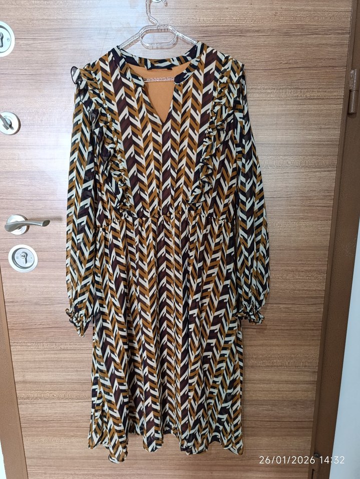 Bohem tarzda, V yakalı ve uzun kollu, bol kesim, pileli, kahverengi uzun elbise. Yumuşak sentetik kumaştan, bağlama desenli.