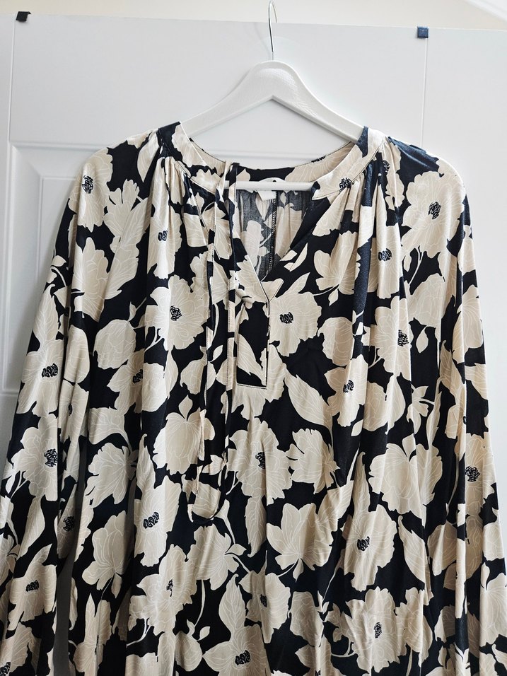 Pamuklu, drapeli, V yakalı ve uzun kollu, bol kesim uzun elbise. Koyu renkli çiçek desenli, günlük kullanıma uygun.