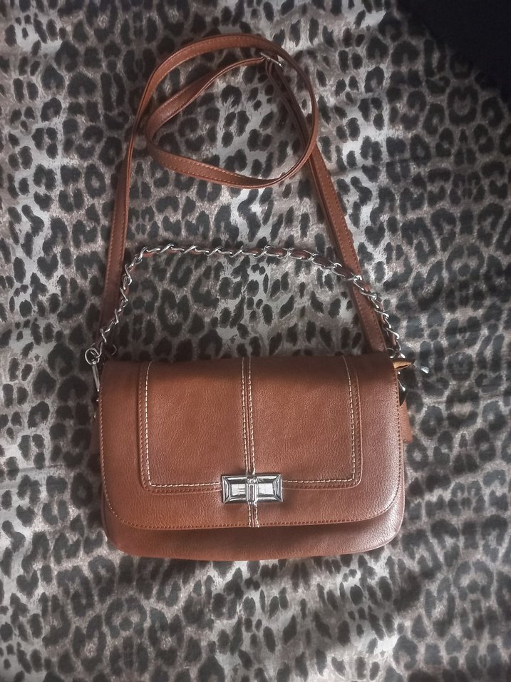 Kahverengi deri çanta, tokalı kapak ve zincir detaylı sap ile bohem tarz sunar. Gri leopar desenli zeminde uyum sağlar.