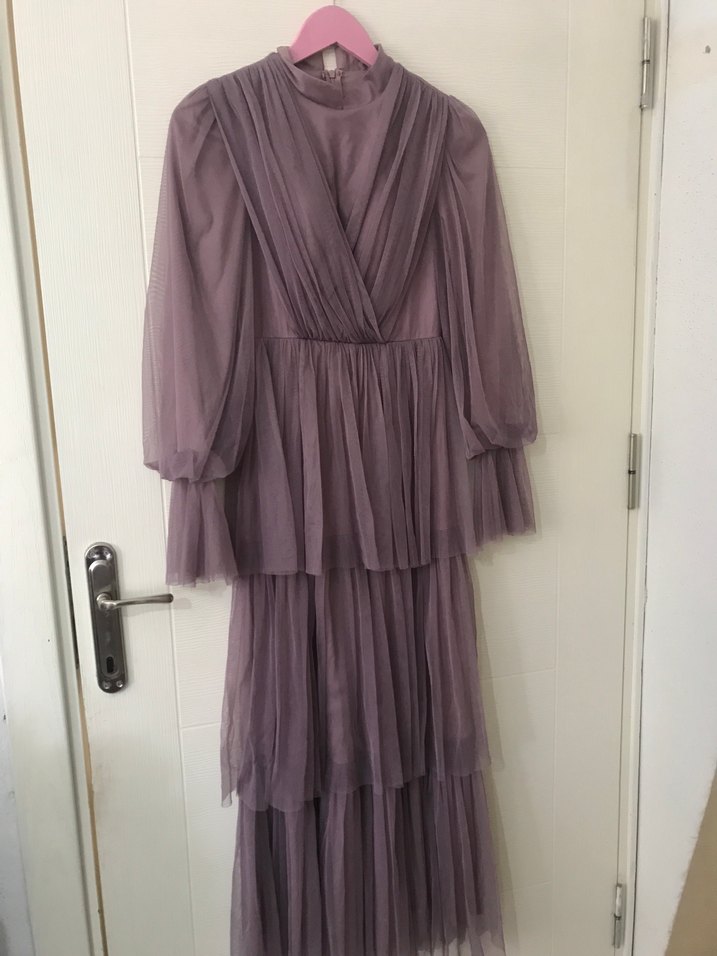 Yüksek yakalı, drapeli gövde ve kat kat etekli, uzun ve bol kesim mor elbise iki kere giyildi kemeri yok fiyata yardımcı olabilirim