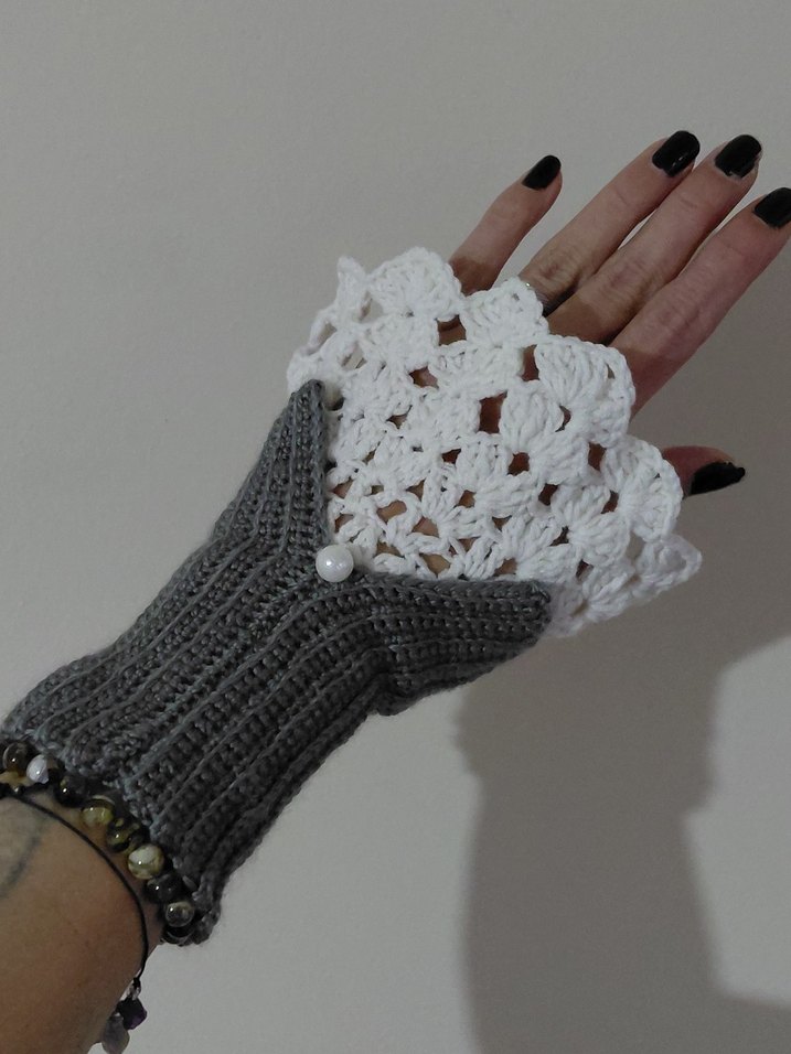 Gri örgü bohem tarzı eldivenler, beyaz dantel detayları ve inci süslemeyle rahatlık ve retro şıklığı bir araya getirir. dilediğiniz renkte sipariş verebilirsiniz. marka temsili