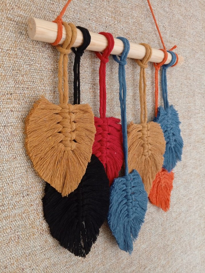Bohem tarzda, renkli yaprak şeklinde makrome parçaların ahşap çubuğa asıldığı doğal ve sanatsal duvar dekoru.