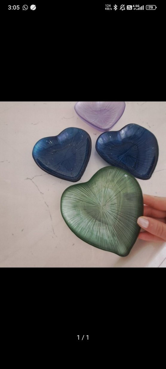 Bohem tarzda, yaprak şeklinde dokulu renkli seramik tabaklar. Yeşil, mavi ve mor tonlarında. 5 adet hafif soyulmalar var