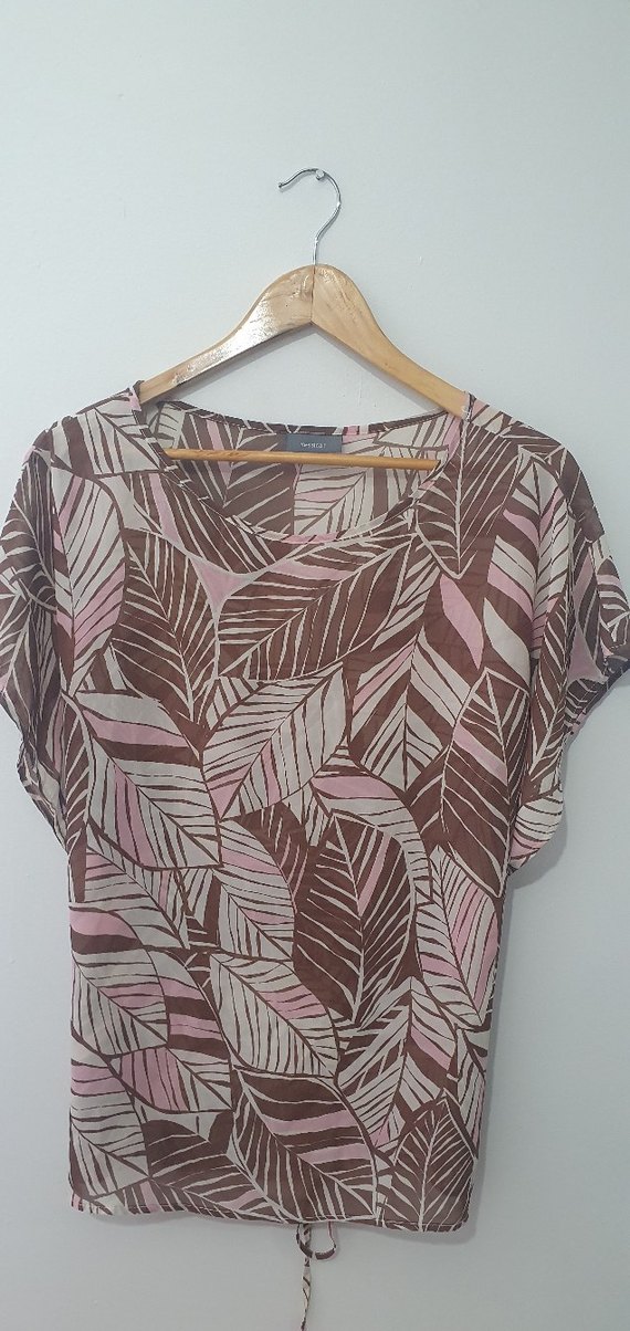 V yakalı, kısa kollu, bol kesim kahverengi bluz. Sentetik kumaş, pastel tonlarda yaprak desenli ve drapeli. Günlük kullanıma uygun.