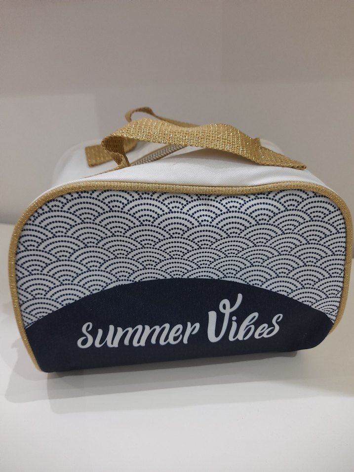 Beyaz sentetik kumaştan, fermuarlı ve 'summer vibes' baskılı makyaj çantası. Parlak detayları ve bohem tarzıyla günlük kullanıma uygundur. üründe makyaj lekelenmeleri vardır . fermuar kısmındasa hafif sararma görsel ekledim.