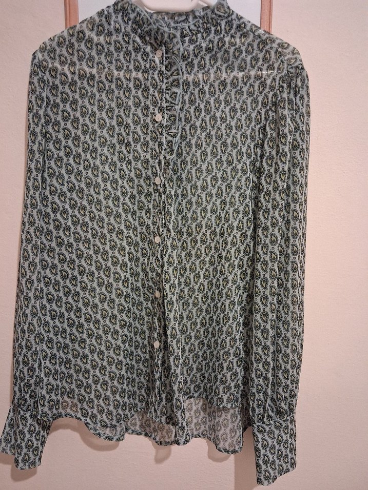 Yüksek yakalı, uzun kollu, düğmeli bohem tarz yeşil kadın bluz. Rahat kesimli ve yumuşak sentetik kumaştan, günlük kullanım için uygundur.