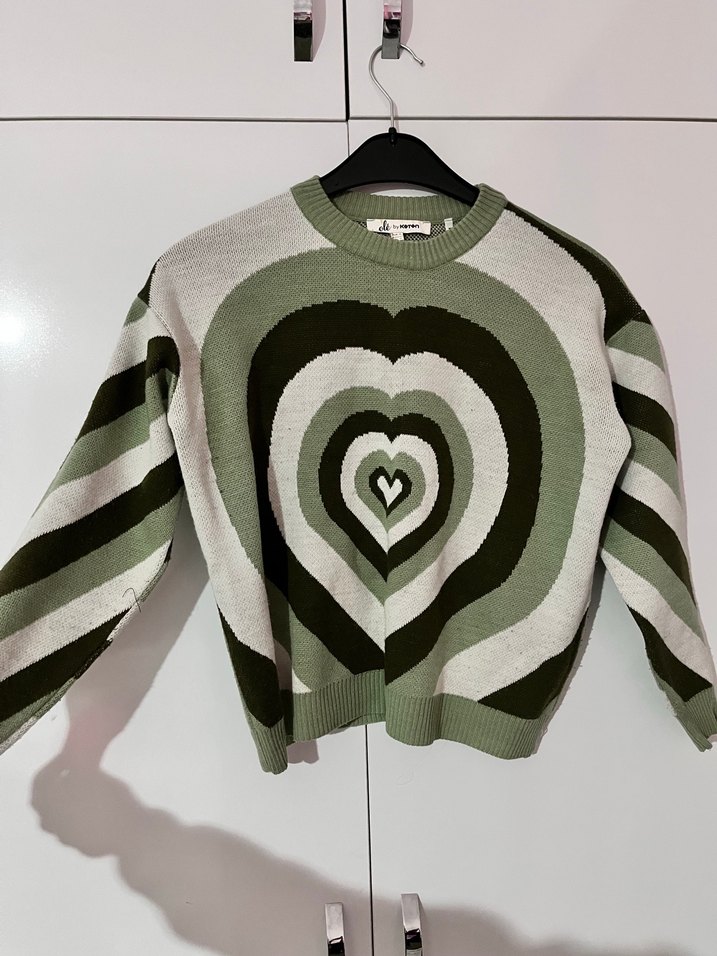 Bohem tarzda, uzun kollu, yuvarlak yaka ve bol kesim örgü kazak. Yeşil ve gri kalp desenleriyle rahat ve retro bir görünüm sunar. Günlük kullanım için uygundur.