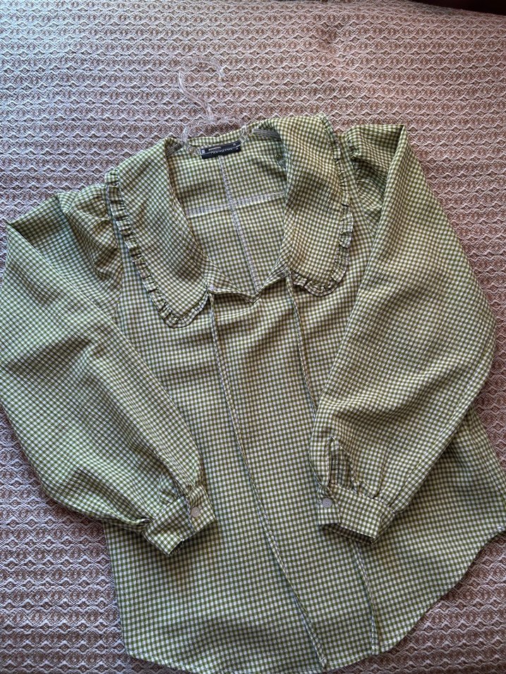 uzun kollu, yakalı ve salaş kesim gömlek. Yeşil kareli vintage desenli, günlük kullanıma uygun. Sadece bir kez giyildi