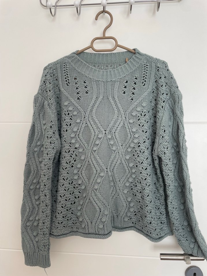 Bohem tarzda, yeşik renkli, uzun kollu ve yuvarlak yakalı örgü kadın kazak, rahat ve salaş kesimlidir.