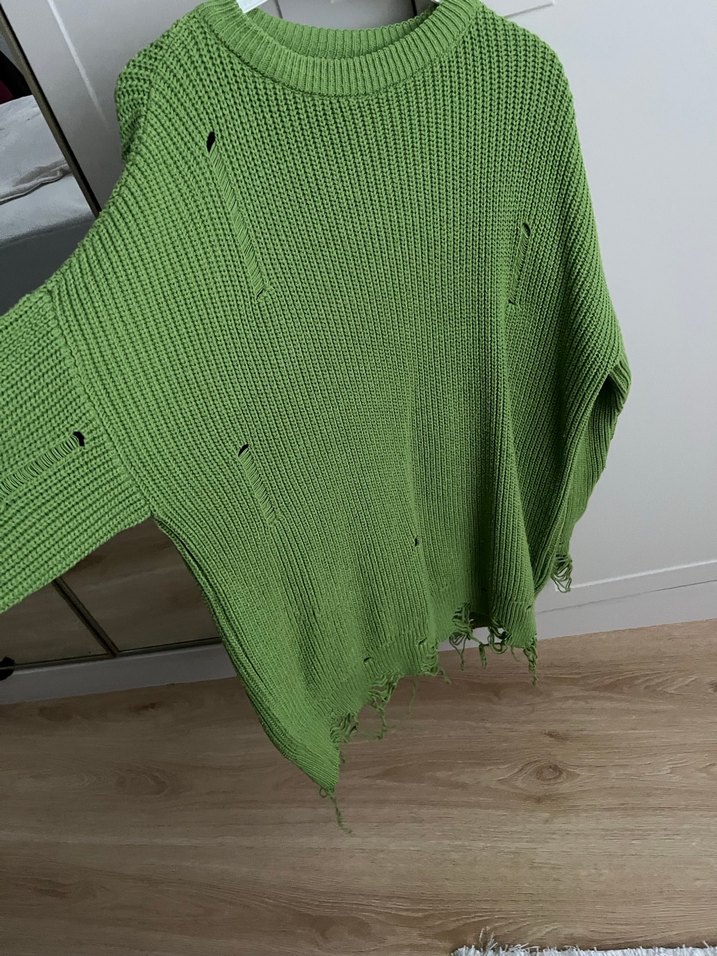 Uzun kollu, yuvarlak yakalı yeşil örgü kazak, bol kesim ve bohem tarzıyla rahat bir görünüm sunar. Günlük kullanıma uygun, yıpranmış detaylı.