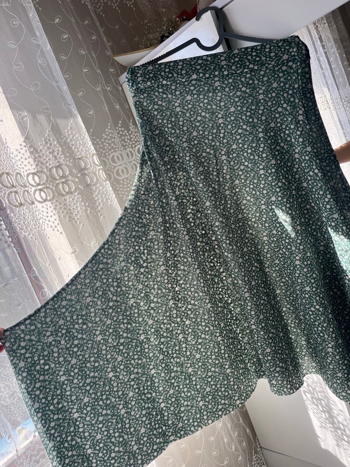 Yeşil renkli, yumuşak sentetik kumaştan, bol ve drapeli uzun hamile eteği. Bohem tarzıyla dış mekan kullanımı için uygundur.
