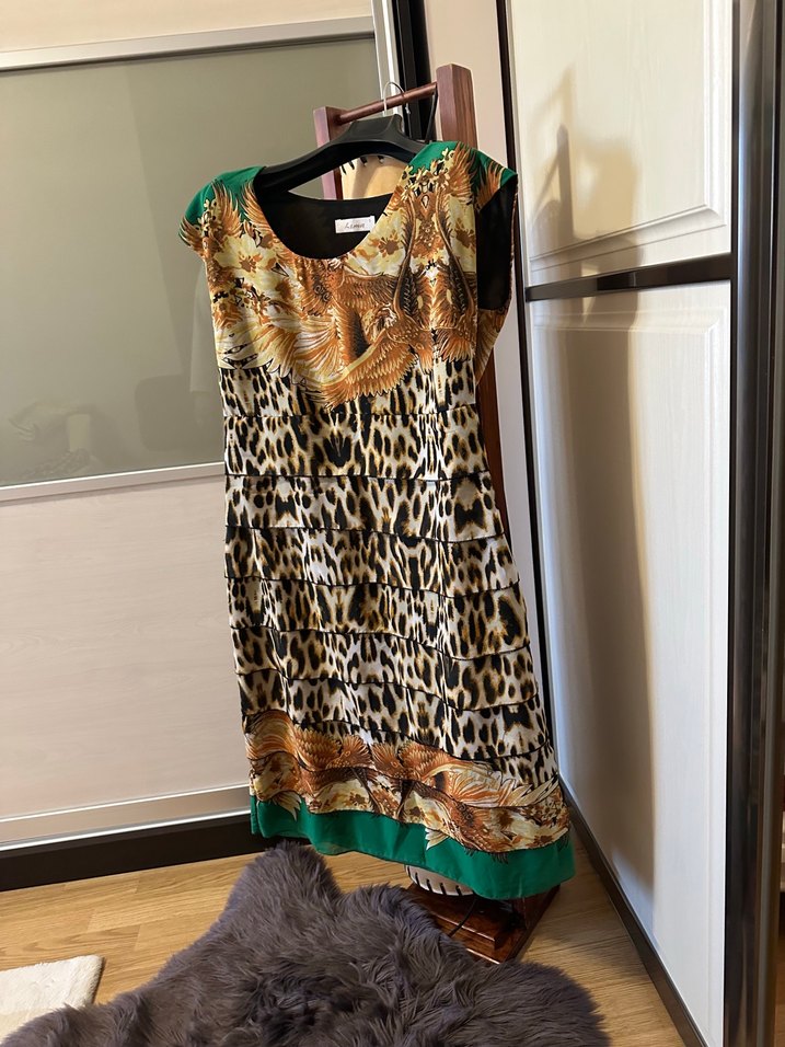 Dizde, rahat kesim ve kolsuz Tekneli yaka, tül kumaşlı kahverengi yılan desenli ve drapeli detaylara sahip. Günlük kullanıma uygun.