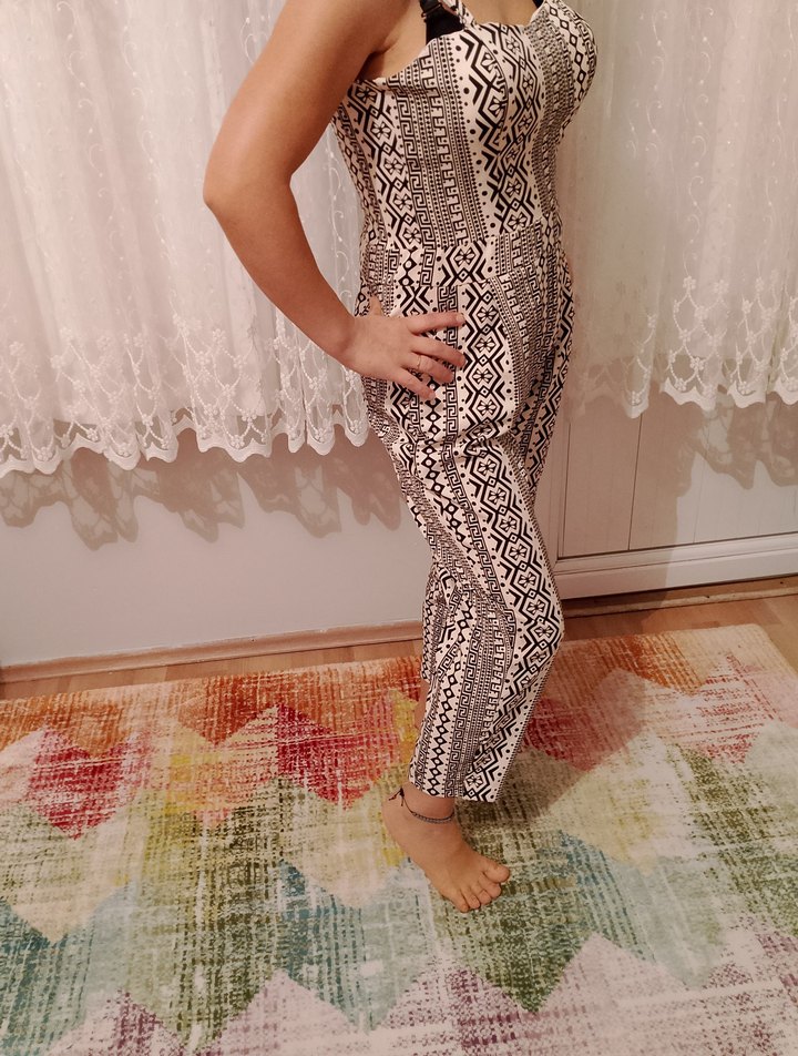 V yaka, dantelli ve askılı kollu, bohem tarzda, yılan desenli kahverengi ve gri renklerde uzun, dar kesim hamile tulumu.