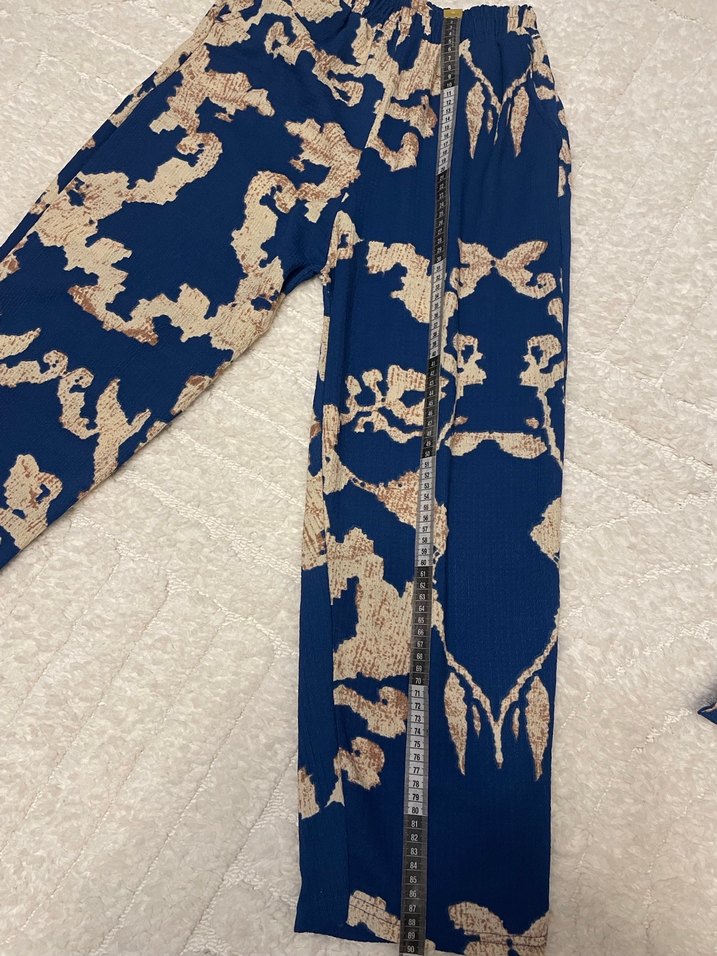 Sentetik kumaştan yapılmış, yılan desenli, bol kesim ve uzun mavi pantolon. bohem tarzına uygundur. Beli lastikli pantolonu cepli kimono takım. Kimononun önü açık düğmesi kemersiz model. Hiçbir kusuru yoktur tüm ölçüler fotoğraflarda mevcuttur. Bir 60 boy 70 kg’a kadar giyildi
