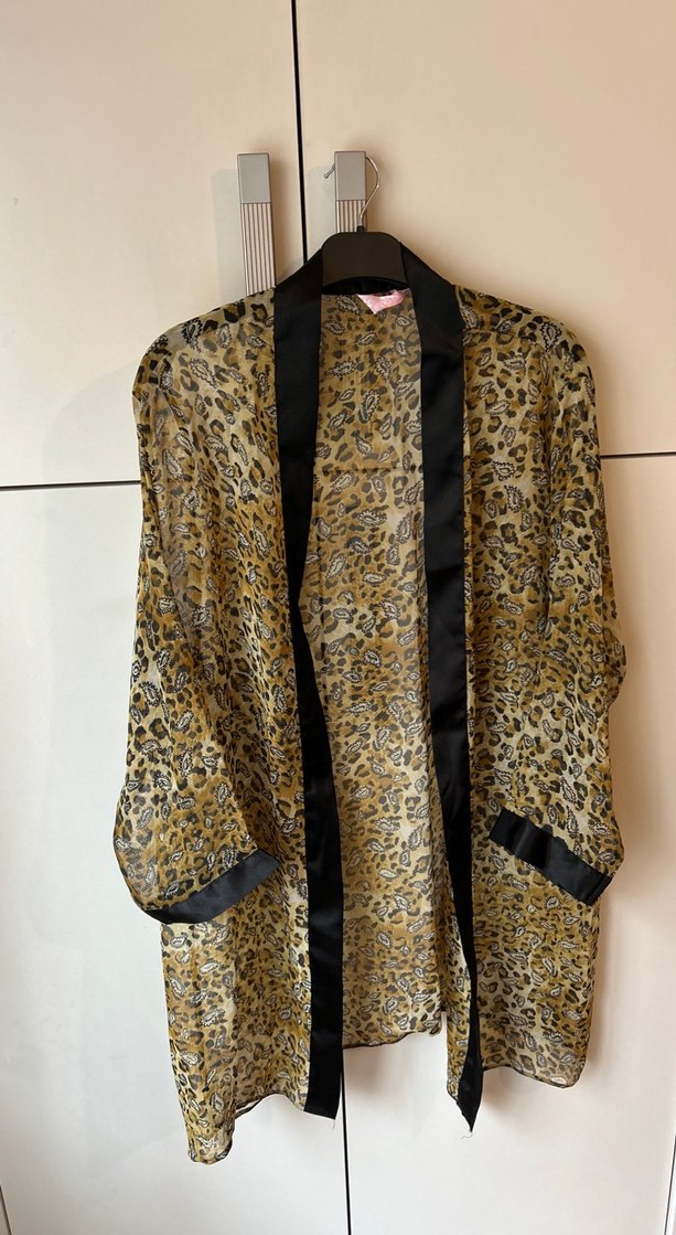 Bohem tarzda, yılan desenli, drapeli ve askılı kolları olan, normal boy midi kimono. Kahverengi tonlarında, notched lapel yakalı.