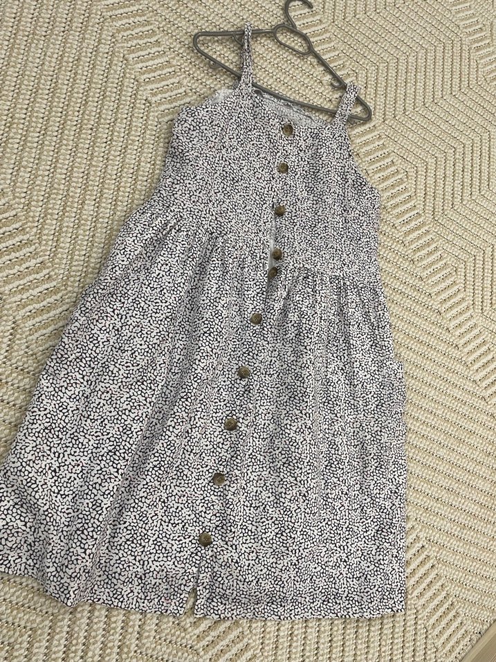 Düğmeli ön ve askılı yaka detaylı, yılan desenli, bol kesim uzun elbise. Yumuşak sentetik kumaştan, bohem tarz için uygun. Xs-S bedene uyar