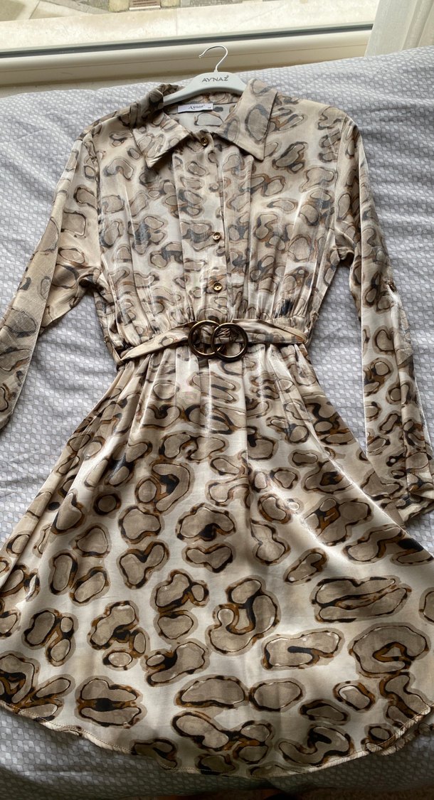 Bej yılan desenli uzun elbise, bohem tarzda. Yakalı, bol kesim, kemerli ve sentetik kumaştan yapılmıştır.