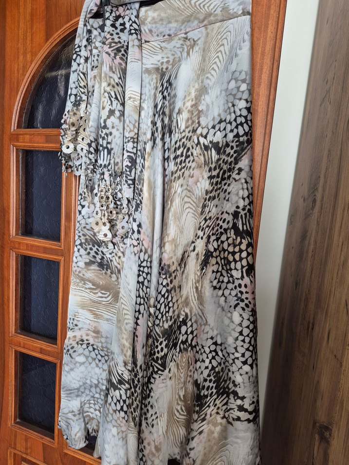 Bohem tarzda, yılan desenli gri ve kahverengi uzun etek. şifon kumaştan, bol kesim ve drapeli tasarıma sahip, şal ile takımdır