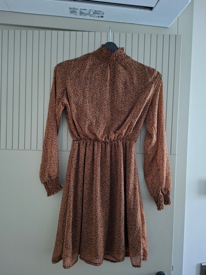 Yüksek yakalı, bol kesim, kahverengi uzun kollu elbise. Pilili detaylar ve yılan desenine sahip, yumuşak sentetik kumaştan yapılmıştır. Günlük kullanıma uygun bohem tarzda.