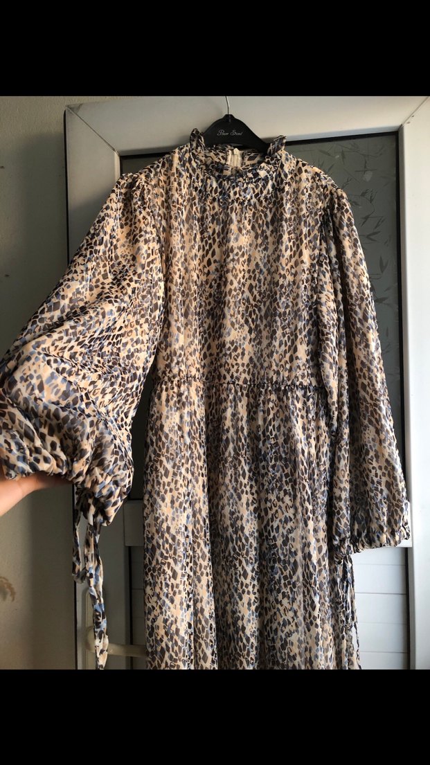 Bohem tarzda, yüksek yakalı ve kürk detaylı, bol kesim uzun elbise. Gri ve kahverengi yılan desenli, yumuşak sentetik kumaştan yapılmıştır.