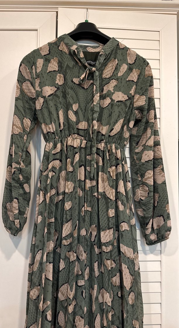 Bohem tarzda, yılan desenli, yüksek yakalı ve uzun kollu, bol kesim pilili uzun elbise. Sentetik kumaştan, açık hava kullanımı için uygundur.