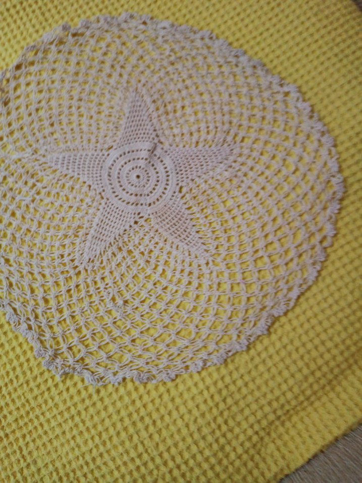 Bohem tarzda, yıldız desenli yuvarlak örgü masa örtüsü. El yapımı detaylarla dekorunuza özgünlük katar.