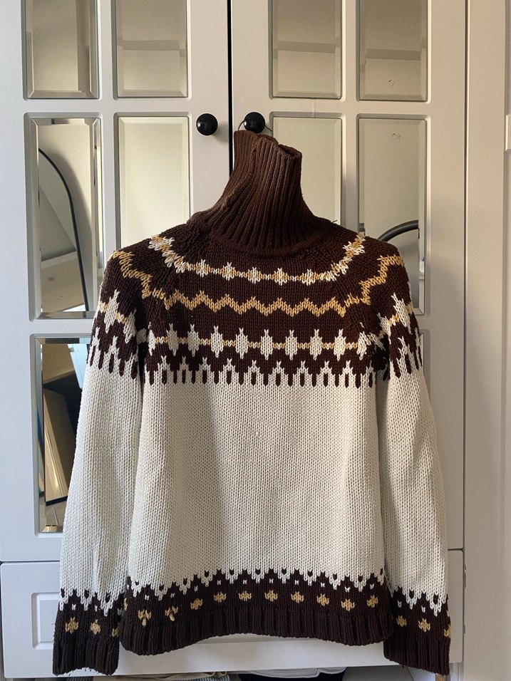 Bohem tarzı, kahverengi ve beyaz örgüden yapılmış, yüksek yakalı ve uzun kollu, vücuda oturan kadın kazak. Günlük kullanıma uygundur.