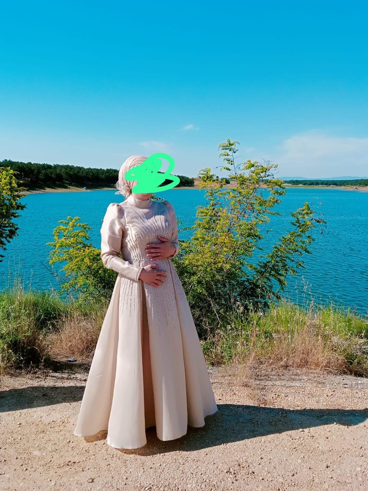 Bohem tarzı, yüksek yakalı, kolsuz ve drapeli beyaz uzun abiye, sade ve şık bir nişanlık elbise. 42 beden sıfır sayılır sadece 2 saat giyildi