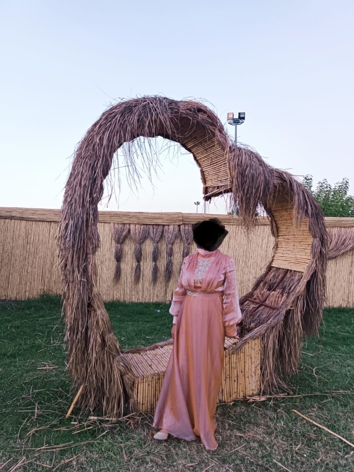 Yüksek yakalı ve askılı kollu, uzun ve bol kesim elbise. Etnik pastel desenlere sahip, camel renkli, drapeli kumaşıyla bohem tarzını yansıtıyor.